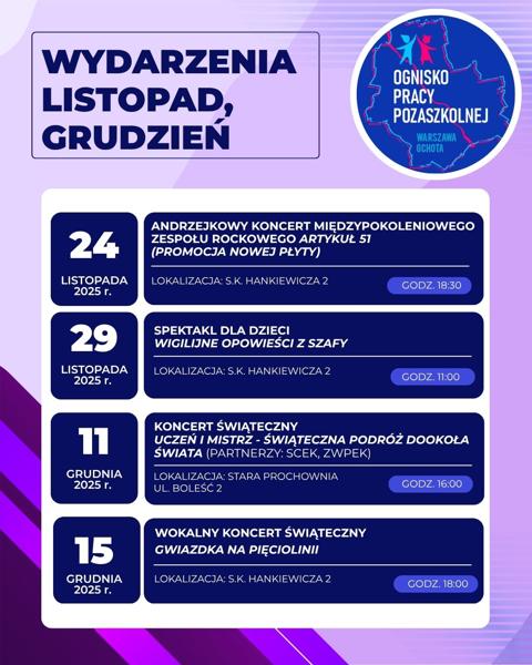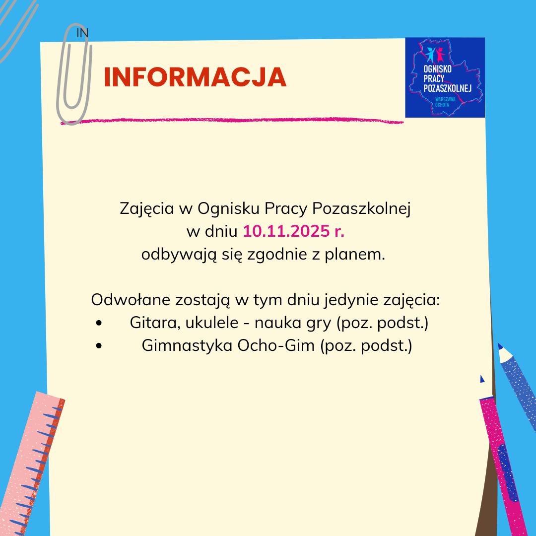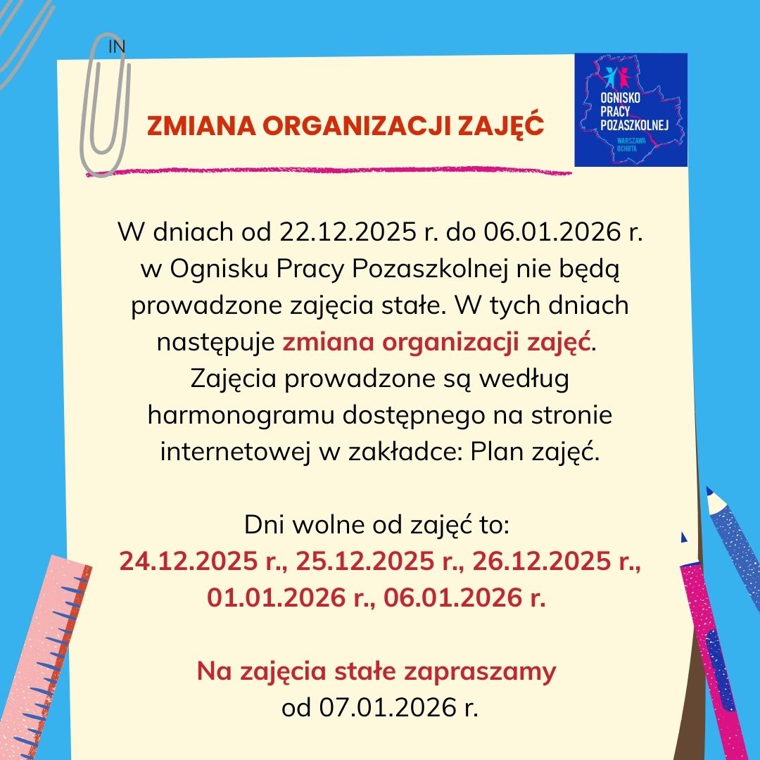 Witamy w Ognisku Pracy Pozaszkolnej w Warszawie przy ul. Majewskiego 17. Zapraszamy na bezpłatne zajęcia: taneczne, muzyczne, teatralne, plastyczne, informatyczne, sportowe, edukacyjne, językowe (angielski, niemiecki).